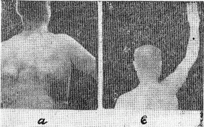 Эта мышца – аналог межпозвонковых мышц- ротаторов на уровне CI-П.. Мышца весьма значима для краниоцервикальной моторики. Она в онтогенезе увеличивает свой объем во много раз больше, чем другие мышцы. При спастическом сокращении она фиксирует ротаторный подвывих СI-П. В условиях врожденной или приобретенной дефектности данной области мышца легко отвечает рефлекторным укорочением. Возникают локальные и склеротомные (с отдачей в затылок) боли, болезненность, кривошея. Так как через нее перегибается n.occipitalis mayor, бывают и признаки выпадения со стороны этого нервного ствола.Цервикалгия (острая, подострая, хроническая). Как и дорзо- и люмбалгия относится к вертебральным синдромам (в отличие от цервико-и пельвиомембральных синдромов). Возникает как склеротомная боль в связи с раздражением рецепторов синувертебрального нерва в задней продольной связке позвоночника. Это, в основном, дискогенный компонент синдрома. Важный компонент синдрома – миотонический, то есть рефлекторный спазм паравертебральных мышц шеи. При асимметричном раздражении возникает рефлекторная кривошея с соответствующим ограничением движений головы, болезненость мышц межостистых связок. При преобладании дистрофических нарушений в капсуах суставов (cervico spondyloperiarthrosis), болезненны их капсулы.Синдром передней лестничной мышцы.Этот давно известный синдром наиболее часто проявляется как рефлекторный ответ указанной мышцы (дефанс, контрактура) на патологию в шейных дисках. Отсюда его рефлекторные проявления: укорочение и болезненность мышцы при движениях в шейном отделе позвоночника – при раздражении источника рефлекса. Вторичные компрессионные проявления обусловлены компрессией нижнего ствола плечевого сплетения: признаки раздражения и выпадения в зоне иннервации локтевого нерва.Синдром средней лестничной мышцы.Подобная картина рефлекторных проявлений + вторичные компрессионные нарушения. Мышца оказывает патологическое воздействие на a.transversa colli. Так как ее нисходящая ветвь кровоснабжает мышцы лопатки, надплечья, соответствующая компрессионная и рефлекторная ишемия проявляется болевой ("невралгической") стадией болезни. Мы считаем эту боль в лопаточной области аналогом болей в миокарде. Мышца оказывает вляние и на n.thoracalis longus – отсюда миотрофия мышц лопатки (особенно m.serratus anterior). Отсюда амиотрофическая стадия. Таков, по нашему убеждению, механизм "невралгической амиотрофии" Персонейдж–Тернера. Источником ирритации бывает, естественно, не только позвоночник.Плече-лопаточный периартроз.Давно известная ортопедам картина часто бывает цервикогенной рефлекторной. Рефлекторное укорочение большой грудной и большой круглой мышцы ограничивает отведение руки в сторону (рис.2). Позже развиваются и рефлекторные нейродистрофические нарушения в соединительно-тканных элементах периартикулярных тканей. Источником раздражения, естественно, могут быть не только ткани позвоночника. Преобладание рефлекторных мышечно-тонческих и нейродистрофических нарушений в большой грудной мышце – частая причина псевдокардиалгического синдрома передней грудной стенки; преобладание мышечно-тонической реакции в малой грудной мышце – причина компрессии плечевого сплетения и аксиальной артерии, т.е. так назывемого "субботнего" или "полицейского" паралича мышц руки.Рис